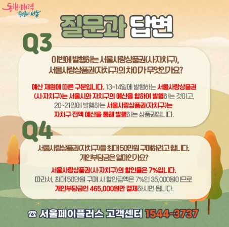 2023년 추석이 성큼 다가왔습니다. 올 가을 춥게 보내지 마시고 따듯하게 보내라고 추석 명절 자치구 서울사랑상품권 발행이 시작되었습니다. 힘든 시기를 보내는 분들을 비롯한 모든 분들 아래에서 서울사랑상품권 받아서 가족분들과 맛있는 것도 많이 먹고 행복한 추석 보내시길 바랍니다.